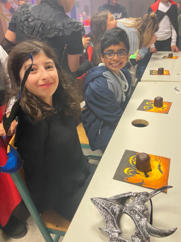 Wir haben mit den Kindern Stop-Tanz gemacht und Limbo getanzt. Fast alle waren gruselig verkleidet. Die Wahl wurde von Herrn Saalfeld gewonnen, der erste Preis (Mensa-Gutschein) ging allerdings an Dalal aus Klasse 6D.